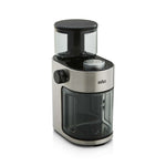 Plastic and aluminum 9 main grind settings and 6 intermediate options from superfine to coarse Professional-quality stainless steel flat burrs Cup selector grinds beans for 2–12 cups of coffee Removable...