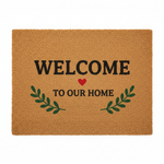 Greet every guest with warmth and charm using the BYMART "Welcome To Our Home" Door Mat — a premium natural coir entrance mat featuring bold "WELCOME TO OUR HOME" lettering, a sweet red heart accent, and elegant green botanical leaf sprigs. A heartfelt, nature-inspired design that makes any home entrance feel instantly inviting.