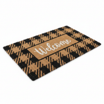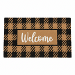 Rustic farmhouse charm meets natural coir durability — bold black and dark brown diagonal buffalo check plaid pattern covering the entire mat with elegant white cursive "Welcome" script in the center. A warm, stylish statement for any home entrance.